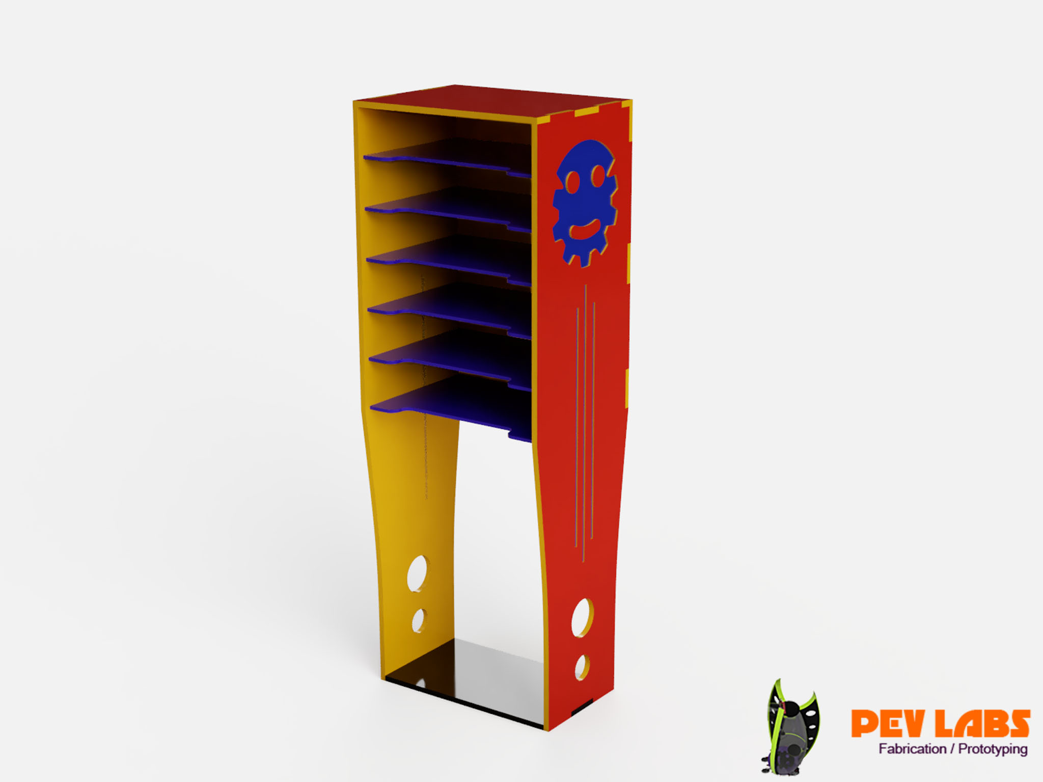 Custom designed for use in our own shop, this flat-pack parts organizer project also can double as bench legs. Made from half inch cabinet grade pre-primed plywood. We CNC milled in dado slots for quarter inch tray separators made of .22" thick Luan plywood. Luan ply is mostly used for vinyl flooring underpayment. Lowes sheet stock is a very attractive and affordable material. The logo was inset with silicon rubber. We keep all our nuts, bolts and doodads and whatnots in these. Unit pops together with a rubber mallet and a few drywall screws. This is a flatpack system which can be assembled easily. Designed to utilize standard hardware store plastic parts trays. Unit is using Stanley SortMaster Junior 14 Compartment Small Parts Organizer. Many of these parts trays are similar sizes so a few other brands or models would probably fit.